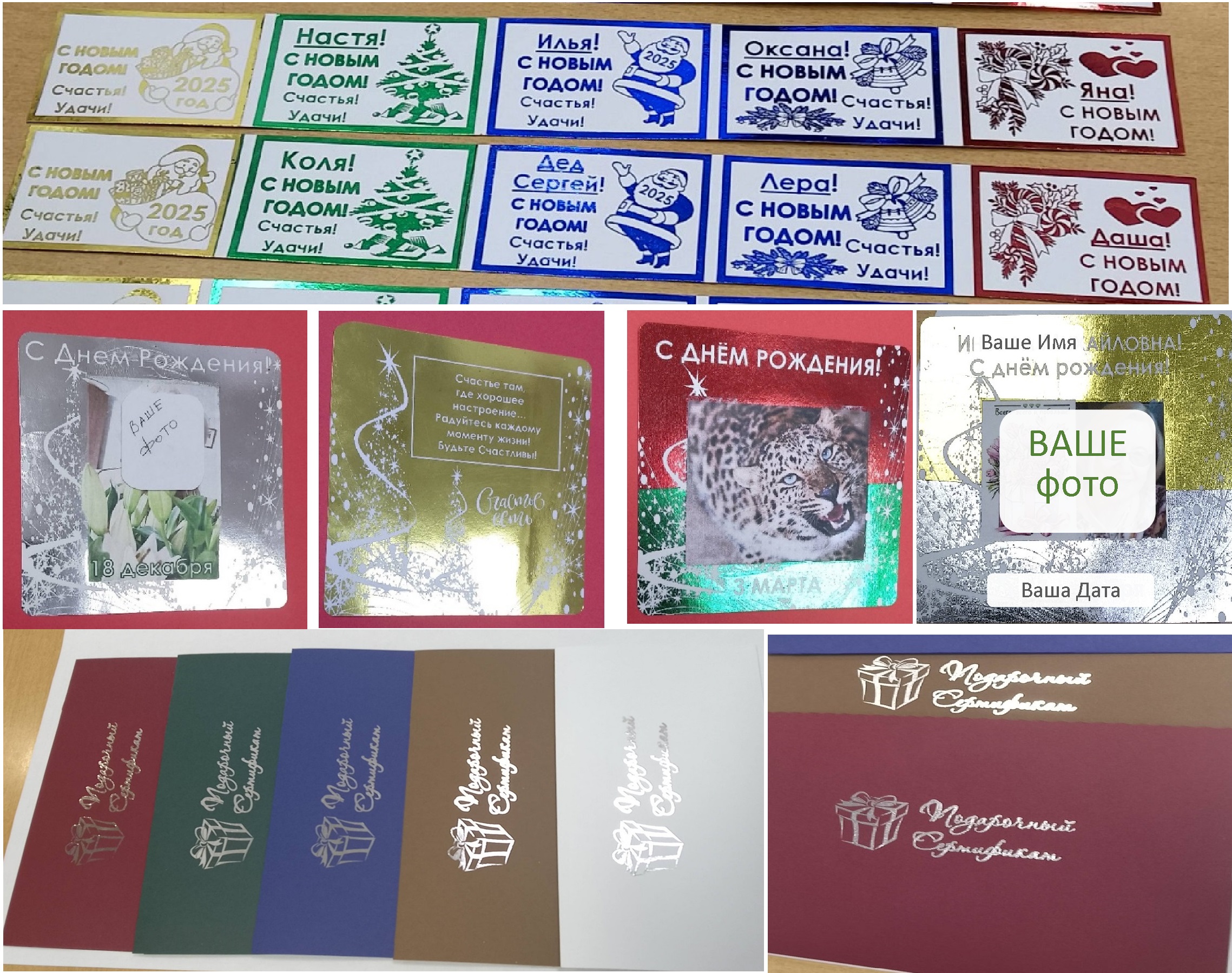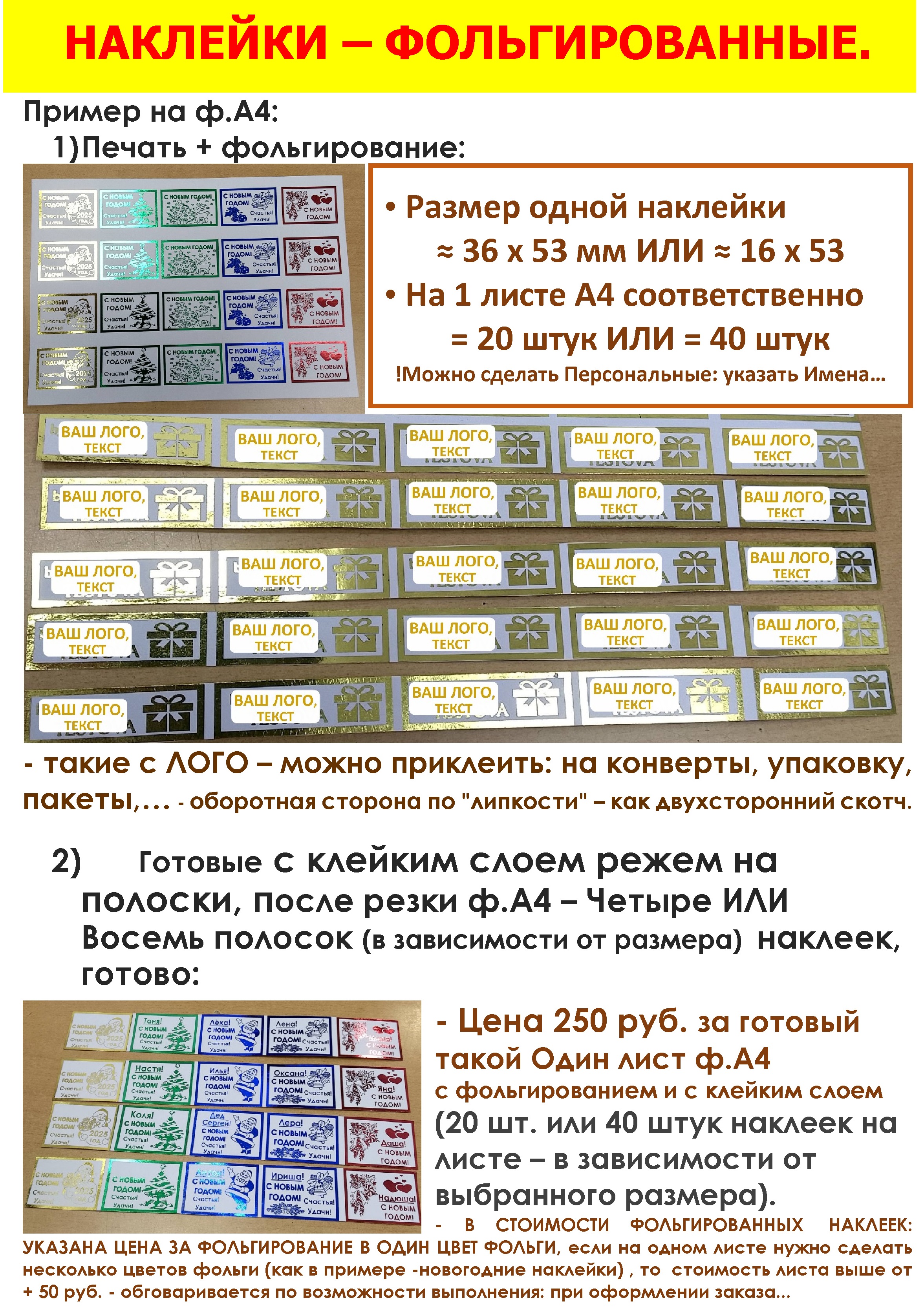 - В СТОИМОСТЬ ФОЛЬГИРОВАННЫХ НАКЛЕЕК: УКАЗАНА ЦЕНА ЗА ФОЛЬГИРОВАНИЕ В ОДИН ЦВЕТ ФОЛЬГИ, если на одном листе нужно сделать несколько цветов фольги (как в примере -новогодние наклейки) , то стоимость листа выше от + 50 руб. - обговаривается по возможности выполнения: при оформлении заказа...