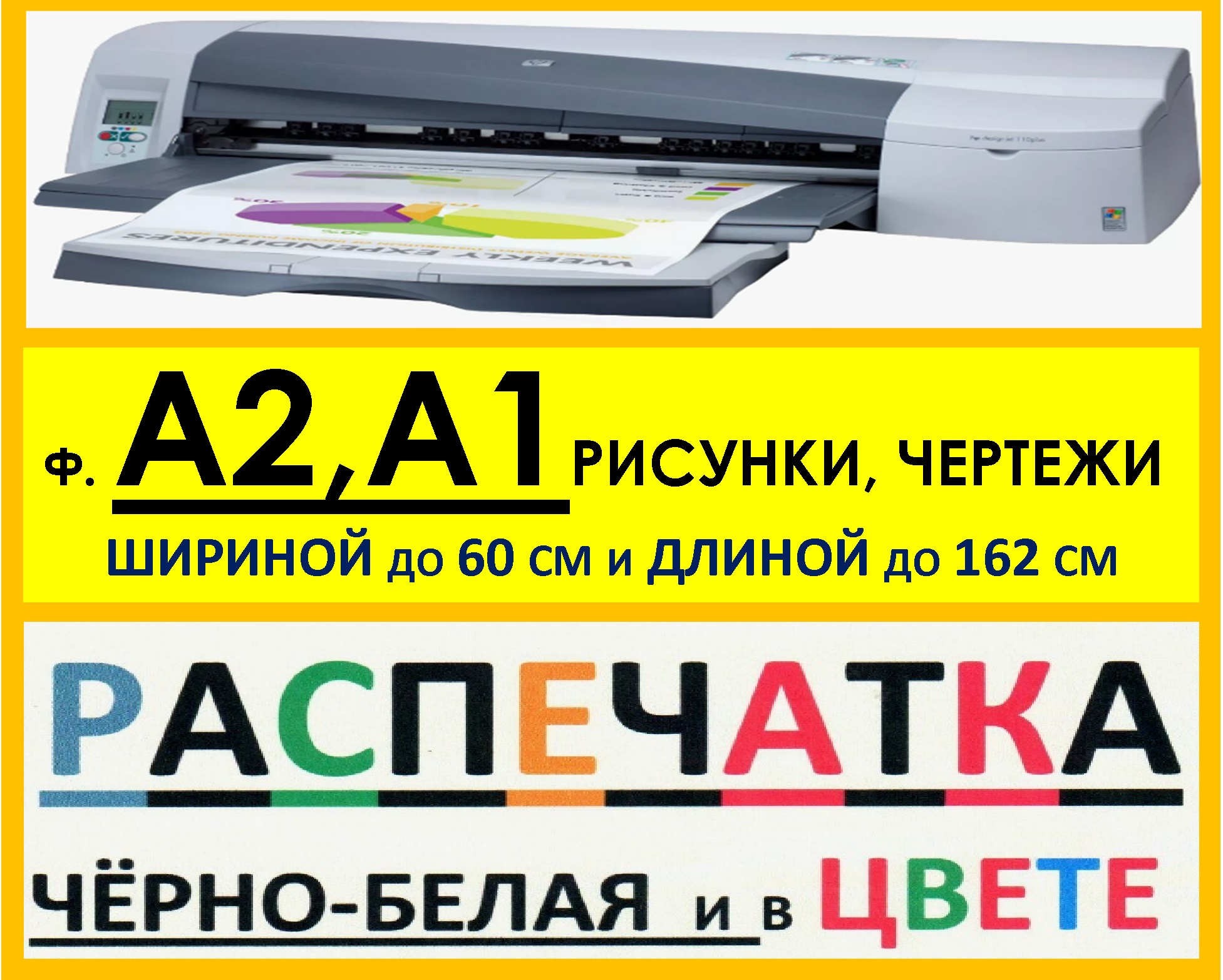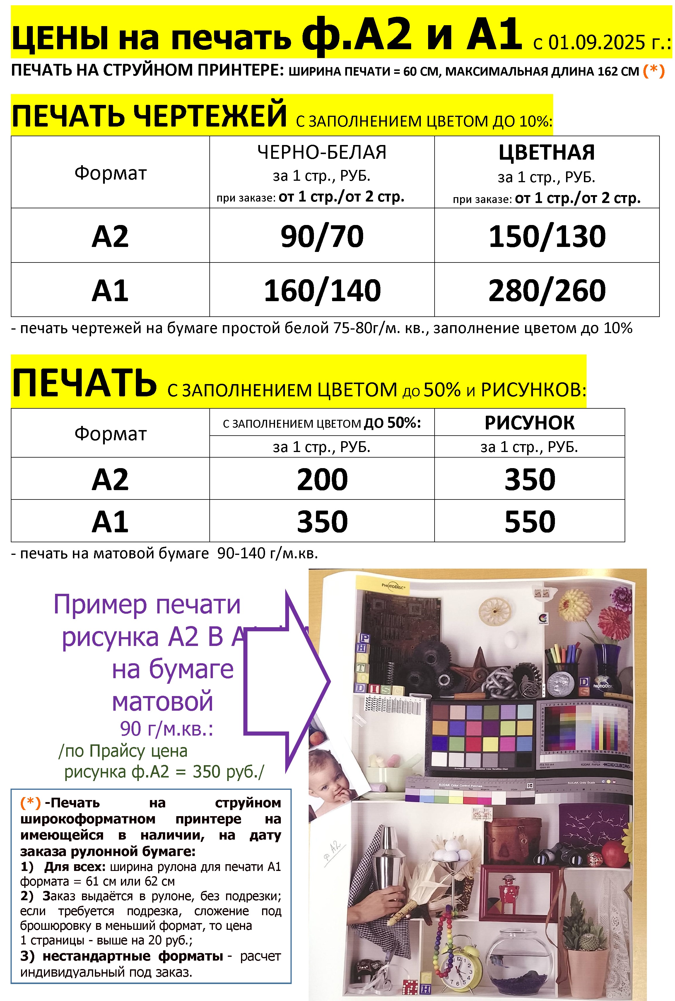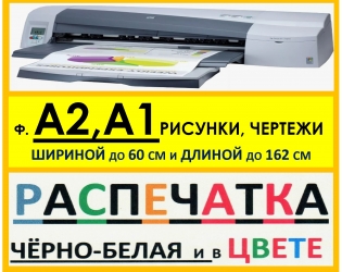 (*) - заполнение краской до5% без заливок, максимальная длина печати =1625 мм и ширина до 600 мм, печать на простой белой бумаге пл.70-80 г/м.кв.
