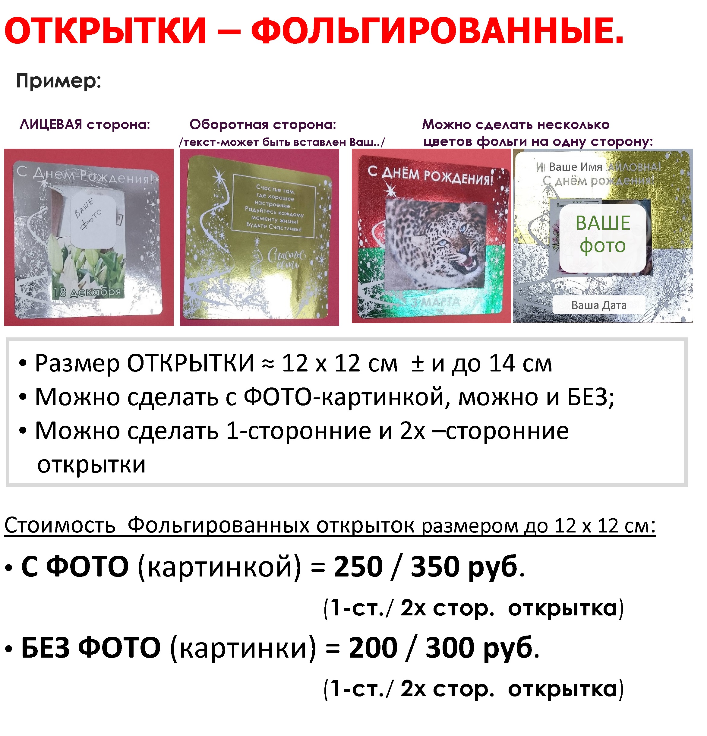 - СТОИМОСТЬ УКАЗАНА БЕЗ УЧЕТА ДИЗАЙНЕРСКИХ РАБОТ, печать производится по готовым имеющимся шаблонам с возможным минимальным изменением текста и вставкой ваших фото, даты, имени.